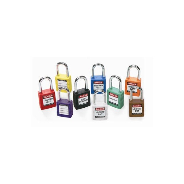 CANDADO DE SEGURIDAD BRADY EN ACERO con aislamiento plástico en color GRIS, pack 6 unid. Una llave por candado.