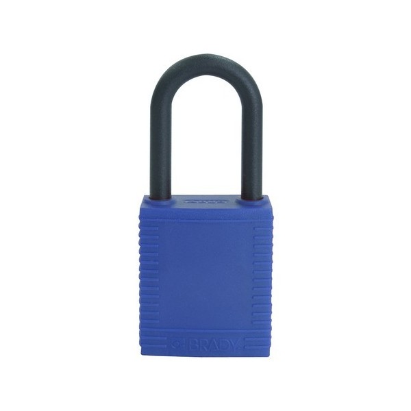 CANDADO DE SEGURIDAD BRADY "NYLON" con cuerpo de aislamiento en nylon color AZUL y arco en nylon. No conductor, no magnético y antiestático, especial para bloqueos eléctricos. Pack de 6 unidades. Una llave por candado. Sistema de seguridad de retención de llave y 6 pins de bloqueo (KD) Keyed diferent (Llaves diferentes) Con 4 etiquetas. Texto: "Danger" y "Property of" (en inglés y francés) Dim.: Arco 38 mm / diam. 6,5 mm. Dim.: 38,10 x 87 x 16 mm (ancho x alto x fondo)