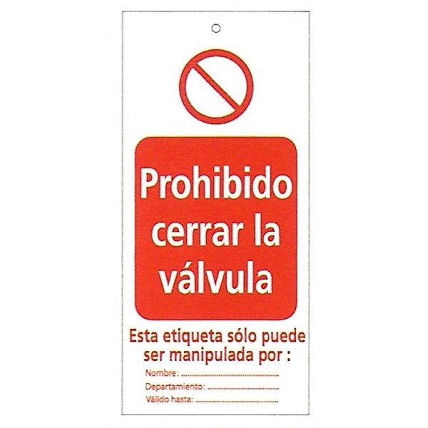 Tarjeta bloqueo PROHIBIDO CERRAR LA VÁLVULA 75 x 160 mm (c/10 unid. + 10 bridas)
