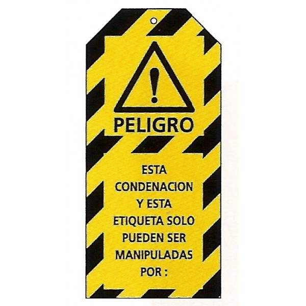 Tarjeta bloqueo PELIGRO, ESTA CONDENACIÓN... 75 x 160 mm (c/10 unid. + 10 bridas)Tarjeta para bloqueo "Lockout & Tagout" "Peligro, est condenacion y esta etiqueta solo pueden ser manipuladas por", de poliéster flexible. Dim.: 75 x 160 mm c/10 unid. con 10 bridas