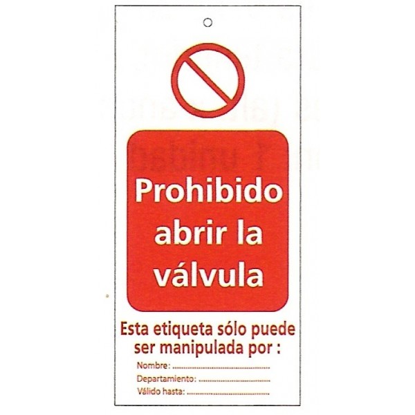 Tarjeta bloqueo PROHIBIDO ABRIR LA VÁLVULA 50 x 110 mm (c/10 unid. + 10 bridas)